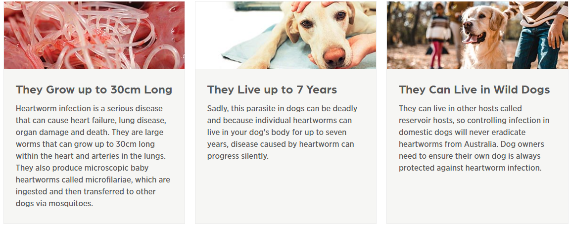 Heartworm is just as serious as it sounds – worms that live in your dog’s heart and lungs. Heartworm disease is caused by a parasite called Dirofilaria immitis and is spread from dog to dog by mosquitoes. Heartworm is endemic in Australia, with more than 2,900 cases reported to Zoetis alone since 2017. Heartworm primarily infects dogs and cats however it also infects wild canids (foxes, dingos, and wild dogs), and the existence of these reservoirs means eradication is impossible. Although rare, heartworm can also infect humans, causing nodules in the lungs, which may be misdiagnosed as cancers or tuberculosis.